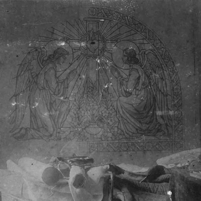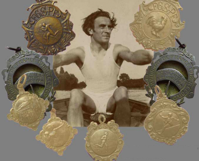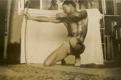 Gaston Suisse posant en tireur à l'arc, dans son atelier, rue de Tolbiac, dans les années 30.